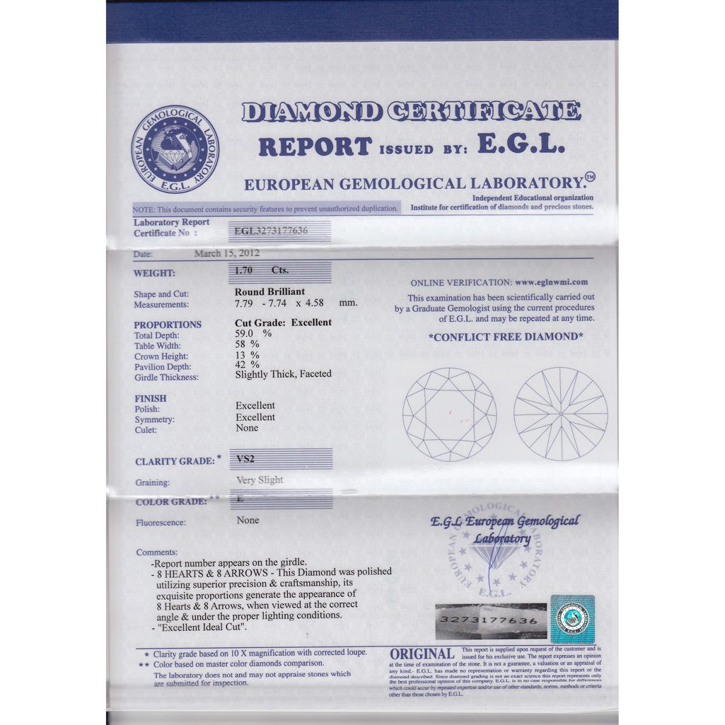 Diamond EGL Certified Round 1.70 ctw E, VS2 **|**|** 7.79x7.74x4.58mm;Cut Excellent; Polish Excellent; Symmetry Excellent; Fluo None; Depth 59%; table58% ; MSRP: $47000