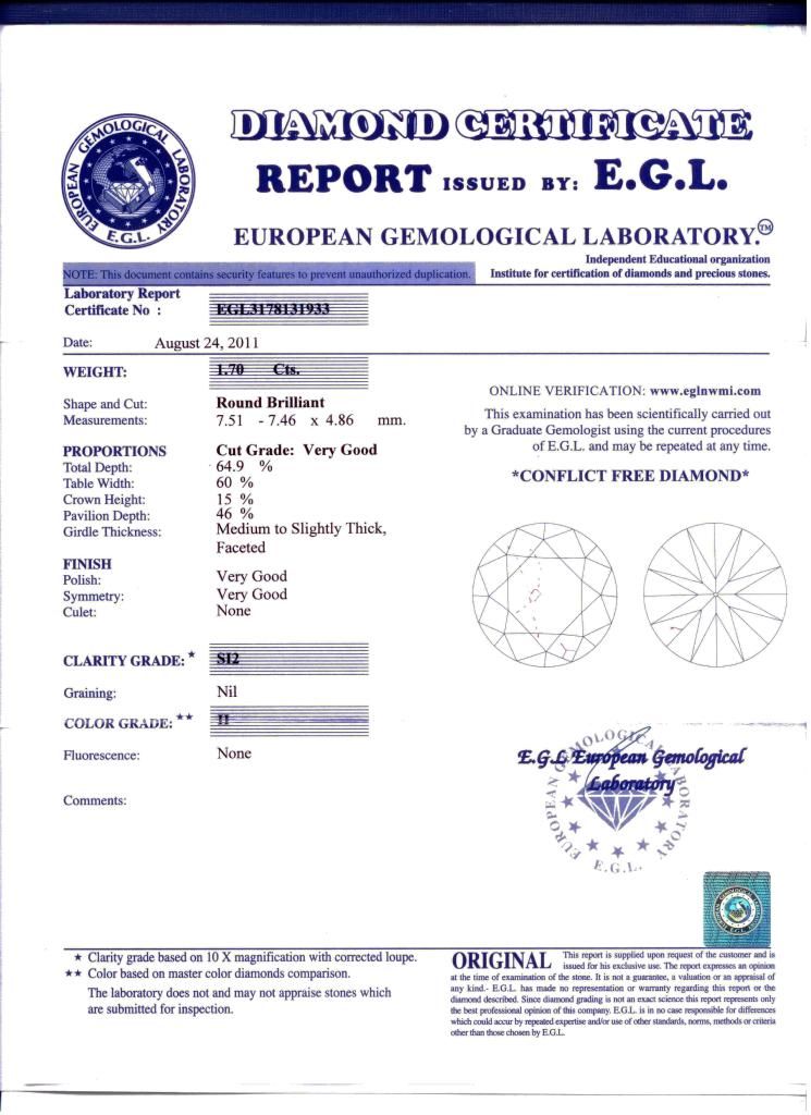 Diamond EGL Certified Round 1.70 ctw H, SI2 **|**|** 7.51x7.46x4.86mm;Cut Very Good; Polish Very Good; Symmetry Very Good; Fluo None; Depth 64.9%; Table 60% ; MSRP: $23384