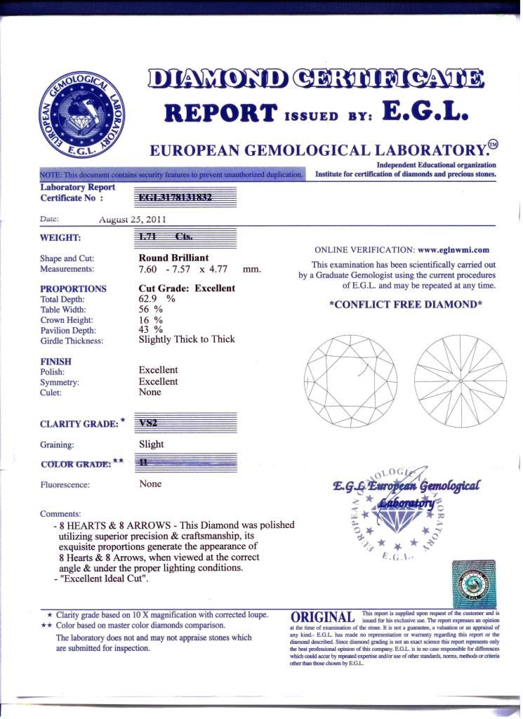 Diamond EGL Certified Round 1.71 ctw H, VS2 **|**|** 7.60x7.57x4.77mm;Cut Excellent; Polish Excellent; Symmetry Excellent; Fluo None; Depth 62.9%; table56% ; MSRP: $29680