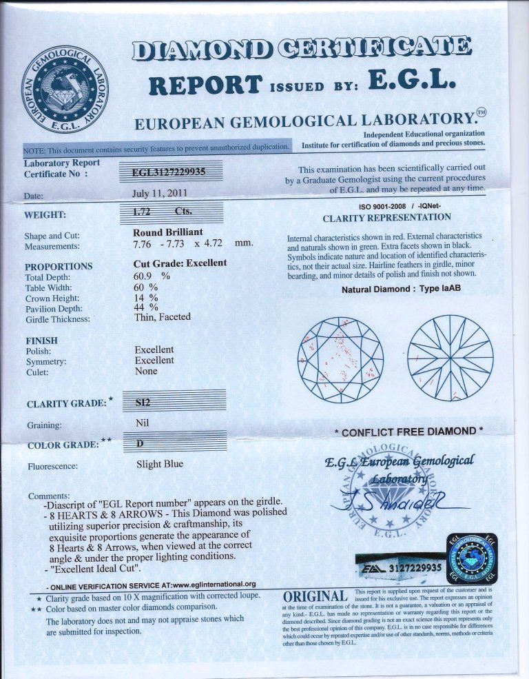 Diamond EGL Certified Round 1.72 ctw D, SI2 **|**|** 7.76x7.73x4.72mm;Cut Excellent; Polish Excellent; Symmetry Excellent; Fluo None; Depth 60.9%; table60% ; MSRP: $31352