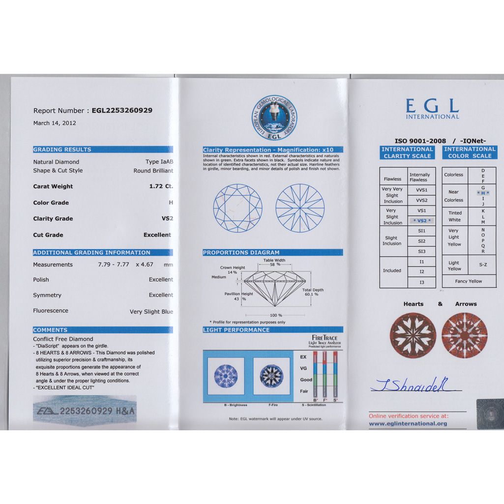 Diamond EGL Certified Round 1.72 ctw H, VS2 **|**|** 7.79x7.77x4.67mm;Cut Excellent; Polish Excellent; Symmetry Excellent; Fluo Very Sligjt Blue; Depth 60.1%; table58% ; MSRP: $31964