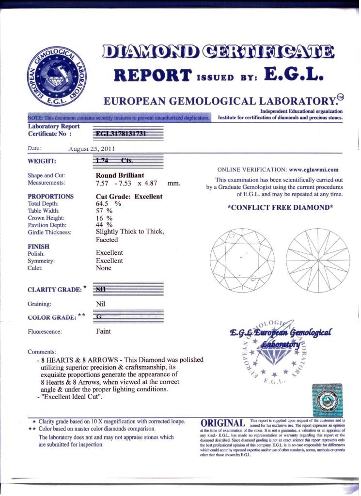 Diamond EGL Certified Round 1.74 ctw G, SI1 **|**|** 7.57x7.53x4.87mm;Cut Excellent; Polish Excellent; Symmetry Excellent; Fluo None; Depth 64.5%; table57% ; MSRP: $32296