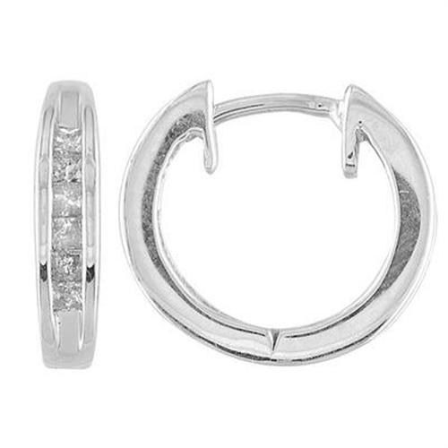 This is a pair of princess cut hoop earrings set in 14kt white gold. There is .25ct of white diamond that are eyeclean.