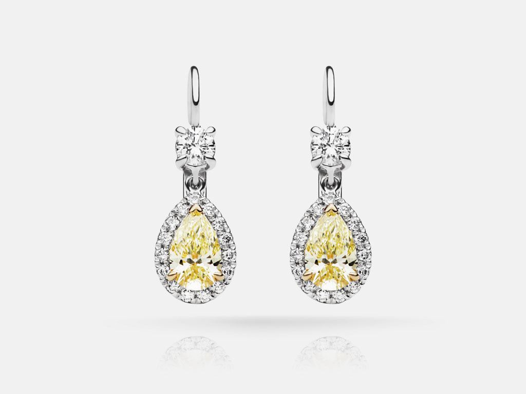 18K Earrings. Featuring 2-1.09 cttw Fancy Yellow Pear Shape set 32-0.65cts G-H SI2 clarity side diamonds.