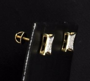 In 10K yellow gold they are 1/4 inch wide and contain thirty two 1/2 point diamonds. They have screw backs for safety. 1.2g
