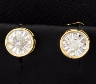 In 10 yellow gold the earrings have .1ct total weight of diamonds, and come with friction backs. .6g