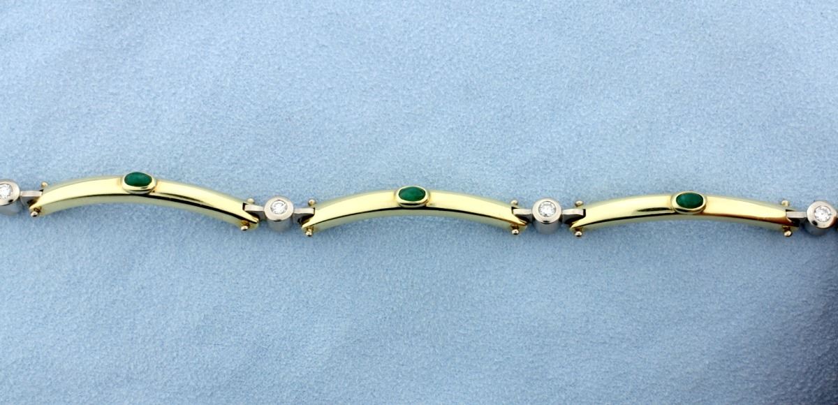 WOW! This Diamond and Emerald bracelet is extremely well made. The bracelet is 14k yellow and white gold. There are 4 brilliant cut bezel set diamonds that total a 1/2 carat--VS-SI clarity and G-H colors. There are also 4 oval 5.5mm x 4.0mm Emerald Cabochons. Bracelet is 4.5mm wide with an inside diameter of 2 1/2". This style is very ART DECO and FABULOUS. This piece looks like new. 29.1g