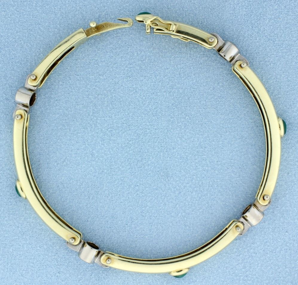 WOW! This Diamond and Emerald bracelet is extremely well made. The bracelet is 14k yellow and white gold. There are 4 brilliant cut bezel set diamonds that total a 1/2 carat--VS-SI clarity and G-H colors. There are also 4 oval 5.5mm x 4.0mm Emerald Cabochons. Bracelet is 4.5mm wide with an inside diameter of 2 1/2". This style is very ART DECO and FABULOUS. This piece looks like new. 29.1g