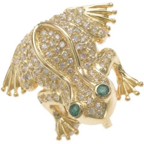 <B>Diamond, Emerald, Gold Pin</B></I><BR><BR>The pin, designed as a frog, features full-cut diamonds weighing a total of approximately 1.00 carat, accented by round-cut emerald eyes, set in 18k yellow gold. A bail, pinstem, and catch mechanism complete the reverse. Gross weight 6.20 grams. <BR><I>Dimensions: 11/16 inch x 7/8 inch</B></I> <B>Condition Report:</B> Very good condition.<BR><BR><b>Shipping:</b> Miscellaneous Collectibles, Smal (<a target="_blank" href="http://www.heritageauctions.com/common/shipping.php">view shipping information</a>)