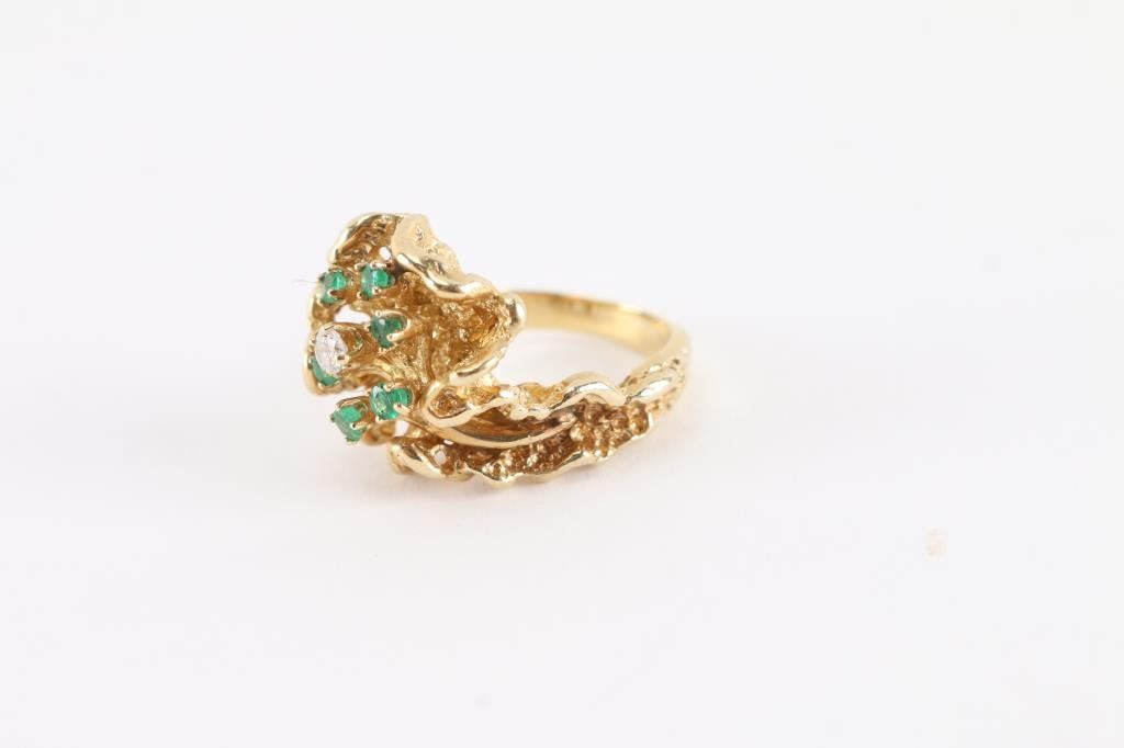 14kt Yellow Gold Size 3, 6 Emeralds Surrounded By Single Diamond.