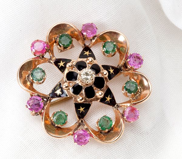 Diamond, Emerald, Ruby, Black Enamel Brooch
