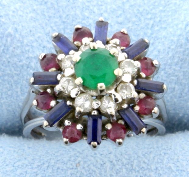 14k White gold. Center Emerald is exceptional quality natural emerald, over 5mm in diameter, .5 ct. 8 baguette sapphires 4mm long each. 8 round rubies 2mm diameter each. 8 diamonds .25ct TW. Size 4.5. 6.3g