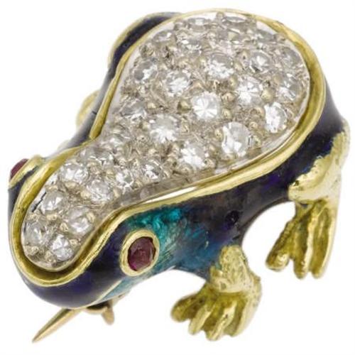 <B>Diamond, Enamel, Gold Brooch</B></I><BR><BR>The brooch, designed as a frog, is enhanced by round-cut rubies and single-cut diamonds, pave set in 14k gold. Total diamond weight is approximately 0.50 carat. Gross weight 6.10 grams. <BR><I>Dimensions: 3/4 inch x 1/2 inch</B></I><BR><BR><b>Shipping:</b> Miscellaneous Collectibles, Smal (<a target="_blank" href="http://www.heritageauctions.com/common/shipping.php">view shipping information</a>)