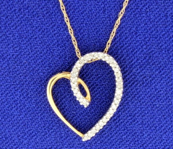 This necklace is 14K yellow gold. The pendant is 5/8 inch long and contains thirty three 1/2pt diamonds. The chain is 19 1/2 inches long. 1.2g