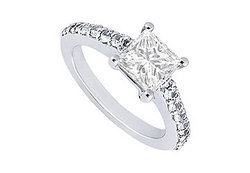 A square diamond is prong-set in the center and is accented by smaller round diamonds on the sides. Made in exquisite platinum This engagement ring has a total weight (TDW) of 1.00 ct.