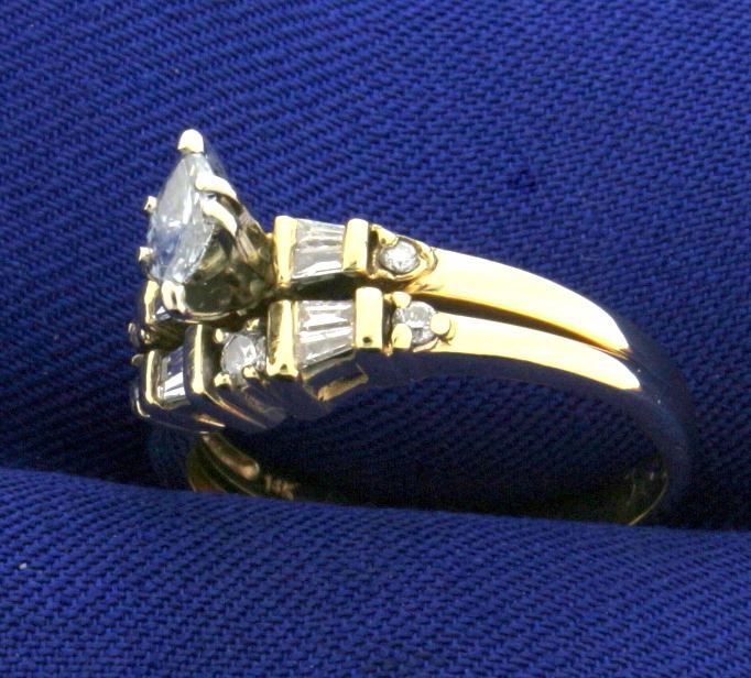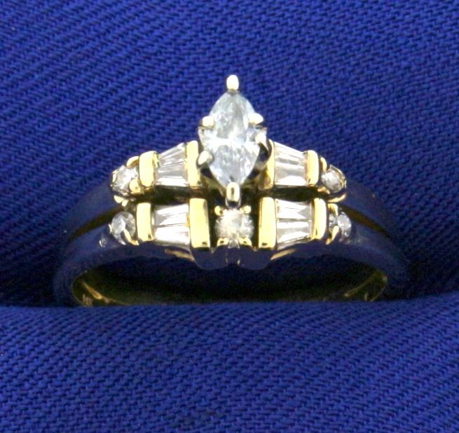 In 14k Yellow Gold. 1/2 ct TW of high quality diamonds. Center is 1/4 carat marquise diamond SI clarity and H color. The balance are brilliant cuts and taper baguette diamonds with similar color and clarity. Size 7. The two rings are soldered together. 4.1g