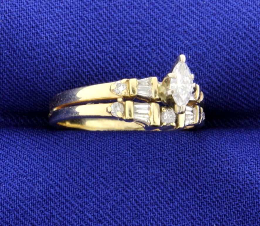 Center is 1/4 carat marquise diamond SI clarity and H color. The balance are brilliant cuts and taper baguette diamonds with total weight including center marquise 1/2 carat. The clarity averages SI and color G-H-I. Size 7. The two rings are soldered together. 4.1g