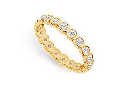 An endless circle of diamonds conveys a sense of no beginning or end a symbol of your eternal love. Brilliant-cut round diamonds are bezel-set in a rich 18K yellow gold mounting. This eternity band has a total diamond weight (TDW) of 1.00 ct.