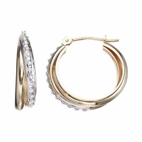 Interlocking hoops adorned with round-cut diamond accents give these 10k gold Diamond Fascination earrings stunning style. Diamond Fascination stones are a dazzling combination of diamonds and crystallized diamond dust. EARRING DETAILSLength: .75 in.Backings: click-itMetal: 10k gold DIAMOND FASCINATION DETAILSDiamond equivalent total weight: less than 1/10 ct.Cut: roundColor grade: H-IClarity: I2