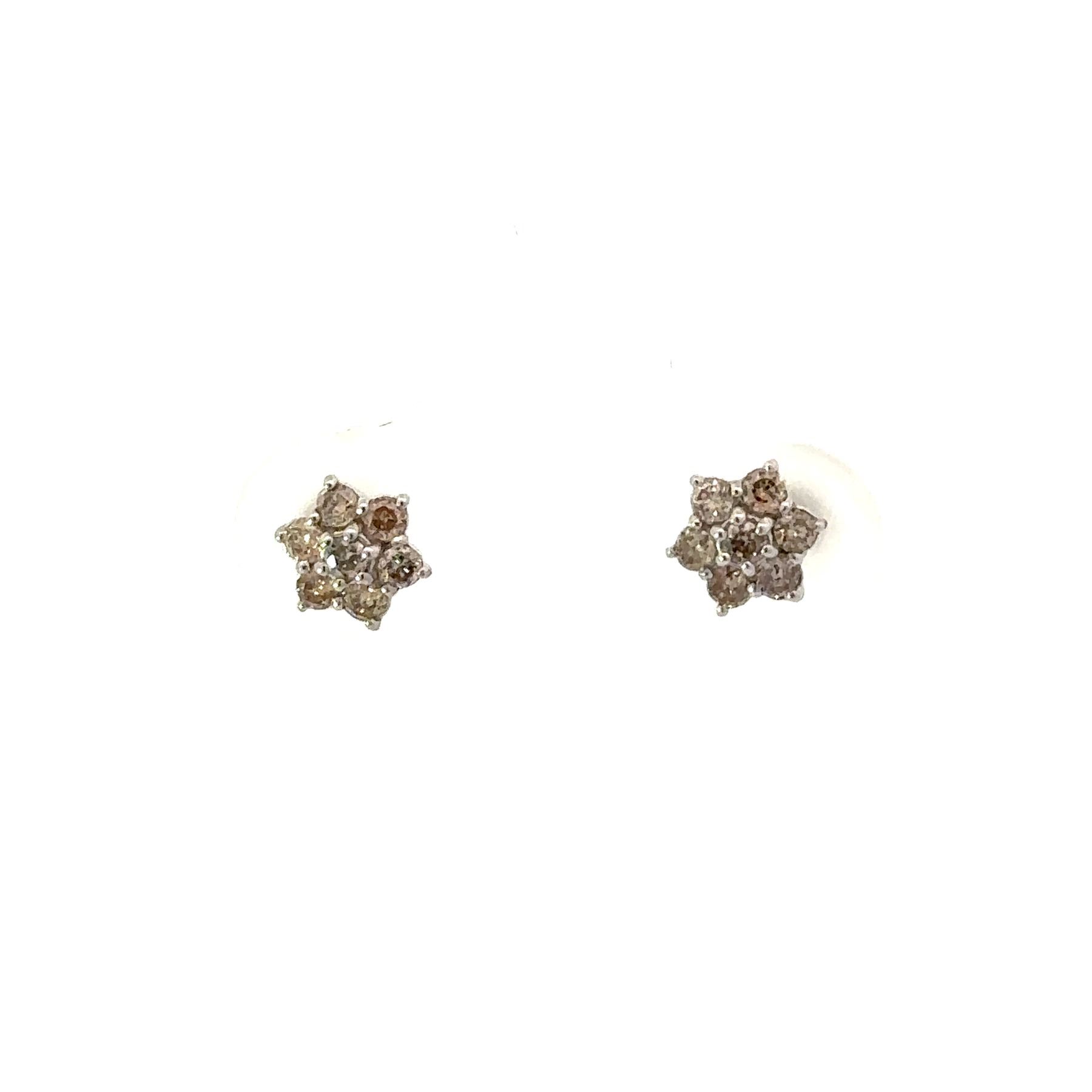 Earth-Mined Diamond Earrings.& nbsp; This is a pair of 18 karat white gold earrings that is prong-set with .30 carats (total) round, brilliant-cut, champagne-colored, SI clarity diamonds.& nbsp; The earrings are approximately 1/4& quot; diameter.& nbsp; Each earring is stamped with the gold and diamond content. These earrings attach to the earlobe with posts and secure silicone backs.& nbsp; This is a brand new item in excellent condition.