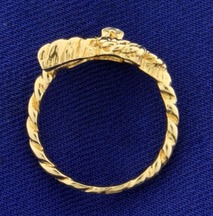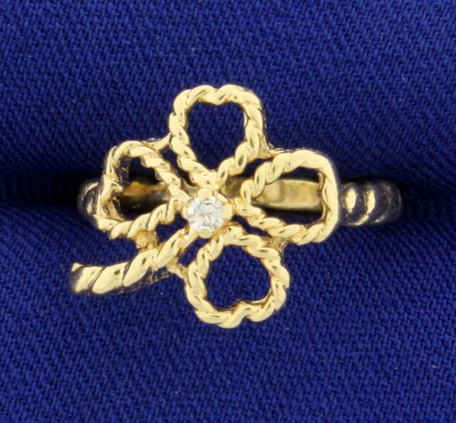 In 14k yellow gold. Contains a high quality .02ct round diamond of VS clarity/G color. Size 5. 2.9g.