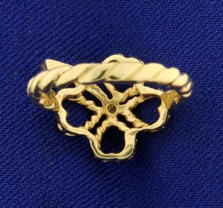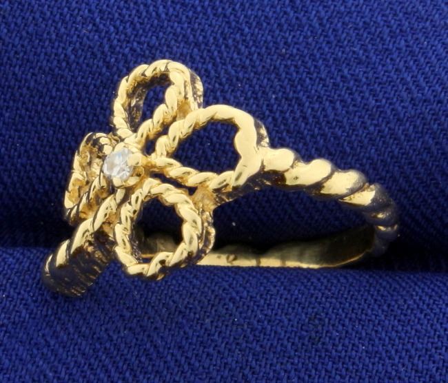 In 14k yellow gold. Contains a high quality .02ct round diamond of VS clarity/G color. Size 5. 2.9g.