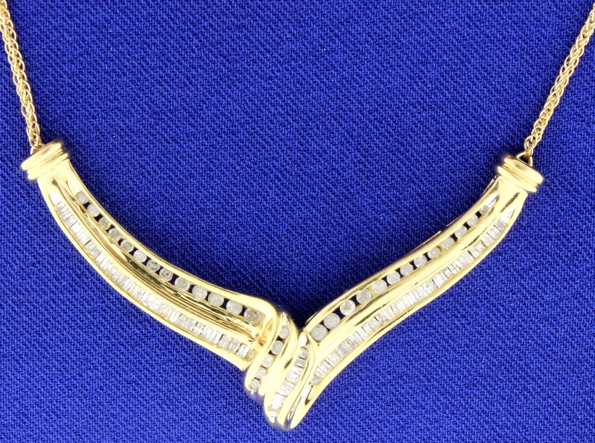 Elegant diamond freeform 10k yellow gold necklace with 1 carat of diamonds! The clarity of the diamonds are SI2-I2 and the colors are I-J-K. The necklace is a great length at 20" long with attached chain. This is a great piece to wear for work or play with its big look.