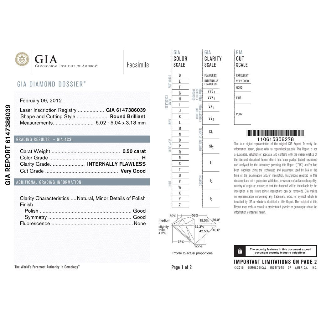 Diamond GIA Cert. 0.50ct H, Int. Flawless **|**|** 5.02-5.04x3.13mm;Cut Very Good; Polish Good; Symmetry Very Good; Fluo None; Depth 40.6%; table 58% Diamond GIA Cert.ID: 6147386039 0.50ct H, Int. Flawless ; MSRP: $17344