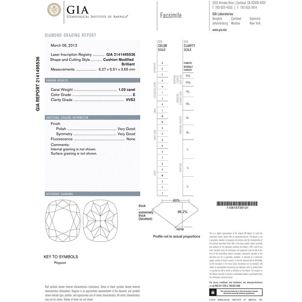 Diamond GIA Cert.:2141495536 Cushion Mod 1.03 ct E VVS2 **|**|** 6.27x5.51x3.65mm;Cut Very Good; Polish Good; Symmetry Very Good; Fluo None; Depth 66.2%; table 60% ; MSRP: $19000