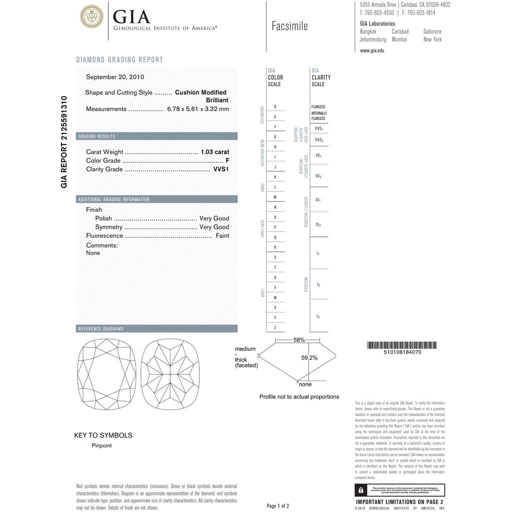 Diamond GIA Cert. Cushion Mod 1.03 ct F VVS1 **|**|** 6.78x5.61x3.32mm;Cut Very Good; Polish Good; Symmetry Very Good; Fluo Faint; Depth 59.2%; table 58% ; MSRP: $22500