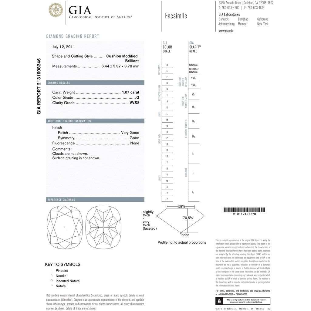 Diamond GIA Cert. Cushion Mod 1.07 ct G VVS2 **|**|** 6.44x5.37x3.78mm;Cut Very Good; Polish Good; Symmetry Very Good; Fluo None; Depth 70.5%; table 59% ; MSRP: $17000