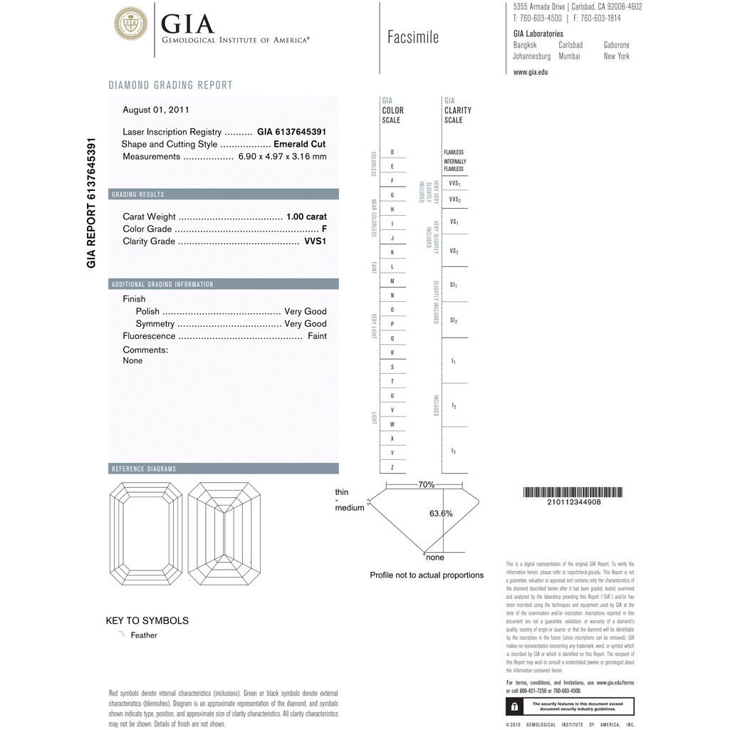 Diamond GIA Cert. Emerald 1.00 ctw F, VVS1 **|**|** 6.90x4.97x3.16mm;Cut Very Good; Polish Good; Symmetry Very Good; Fluo Faint; Depth 63.6%; table 70% ; MSRP: $22500