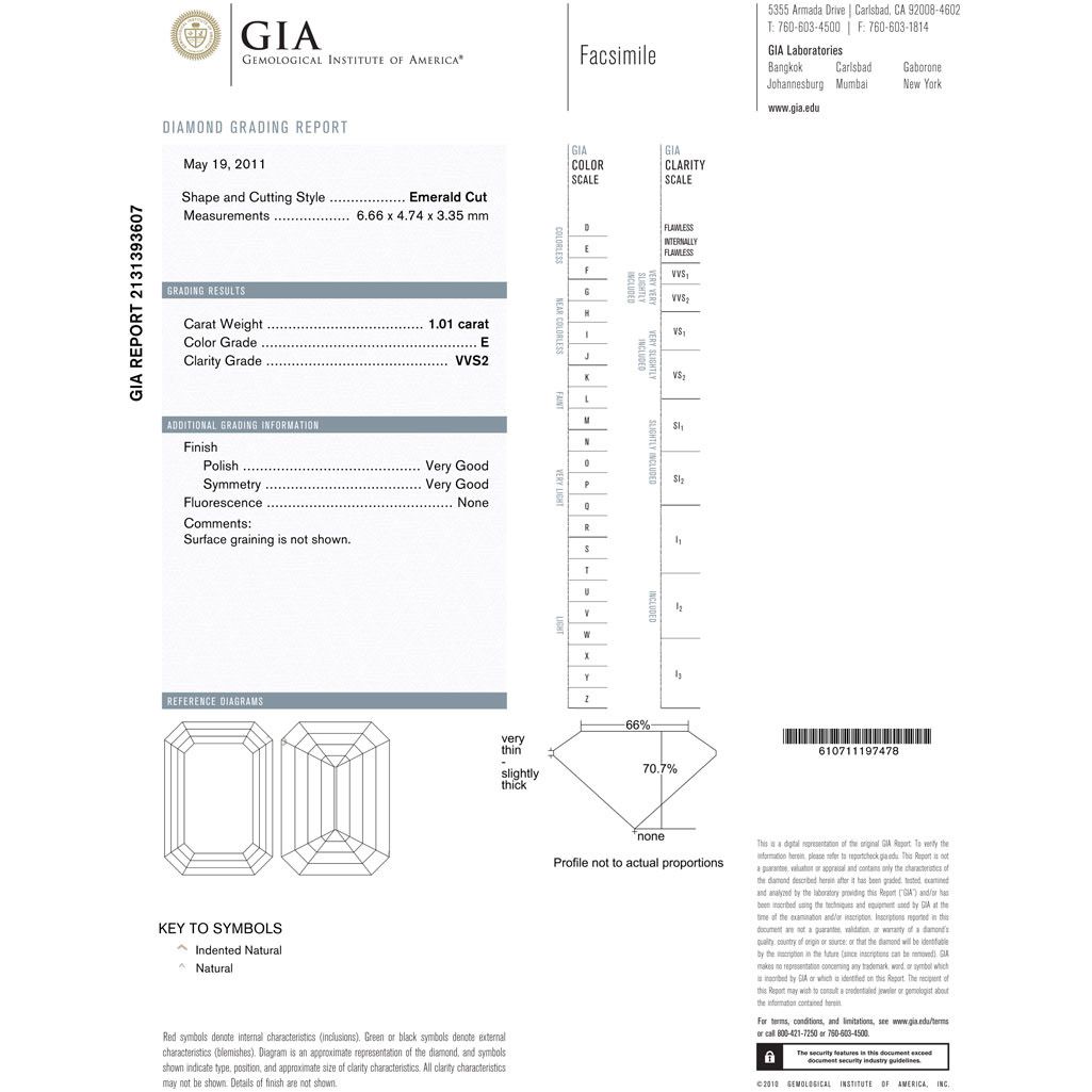 Diamond GIA Cert. Emerald 1.01 ctw E, VVS2 **|**|** 6.66x4.74x3.35mm;Cut Very Good; Polish Good; Symmetry Very Good; Fluo None; Depth 70.7%; table 66% ; MSRP: $25500