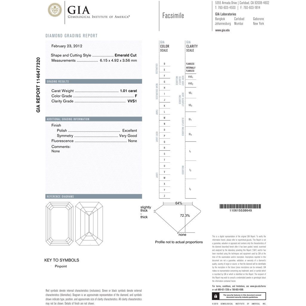 Diamond GIA Cert. Emerald 1.01 ctw F, VVS1 **|**|** 6.15x4.92x3.56mm;Cut Very Good; Polish Excellent; Symmetry Very Good; Fluo None; Depth 72.3%; table 64% ; MSRP: $18500