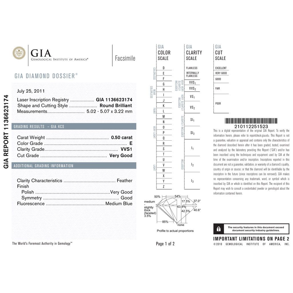 Diamond GIA Cert.ID: 1136623174 Round 0.50 ctw E, VSS1 **|**|** 5.02-5.07x3.22mm;Cut Very Good; Polish Good; Symmetry Very Good; Fluo Medium Blue; Depth 40.6%; table 54% ; MSRP: $14224