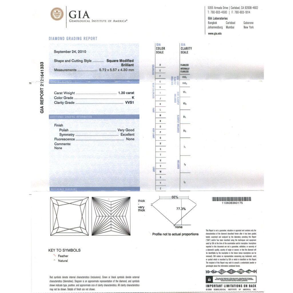 Diamond GIA Cert.ID:2121641333 Square 1.20 ctw K, VSS1 **|**|** 5.72x5.57x4.30mm;Cut Very Good; Polish Good; Symmetry Excellent; Fluo None; Depth 77.3%; table 66% ; MSRP: $15700