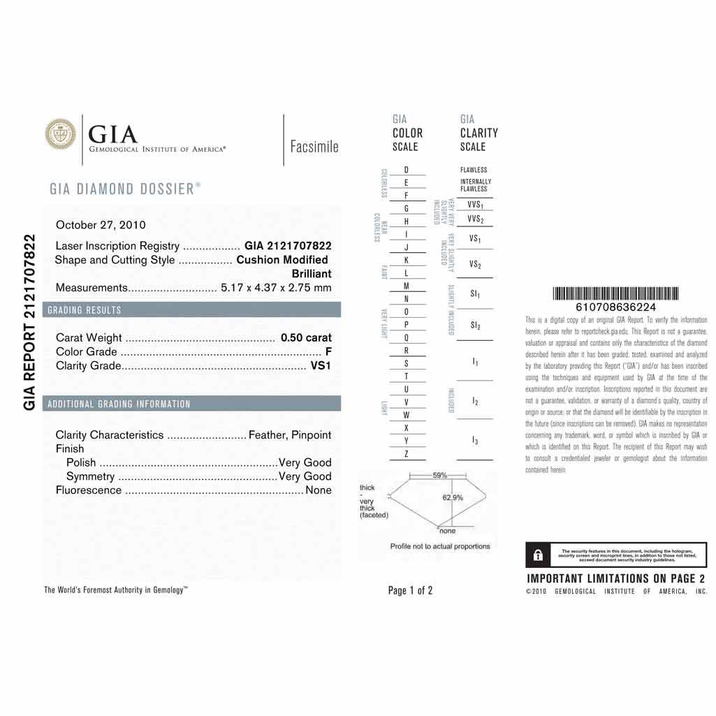 Diamond GIA Cert.ID:2121707822 Cush Mod 0.50 ctw F VS1 **|**|** 5.17x4.37x2.75mm;Cut Very Good; Polish Good; Symmetry Very Good; Fluo None; Depth 62.9%; table 59% ; MSRP: $3800