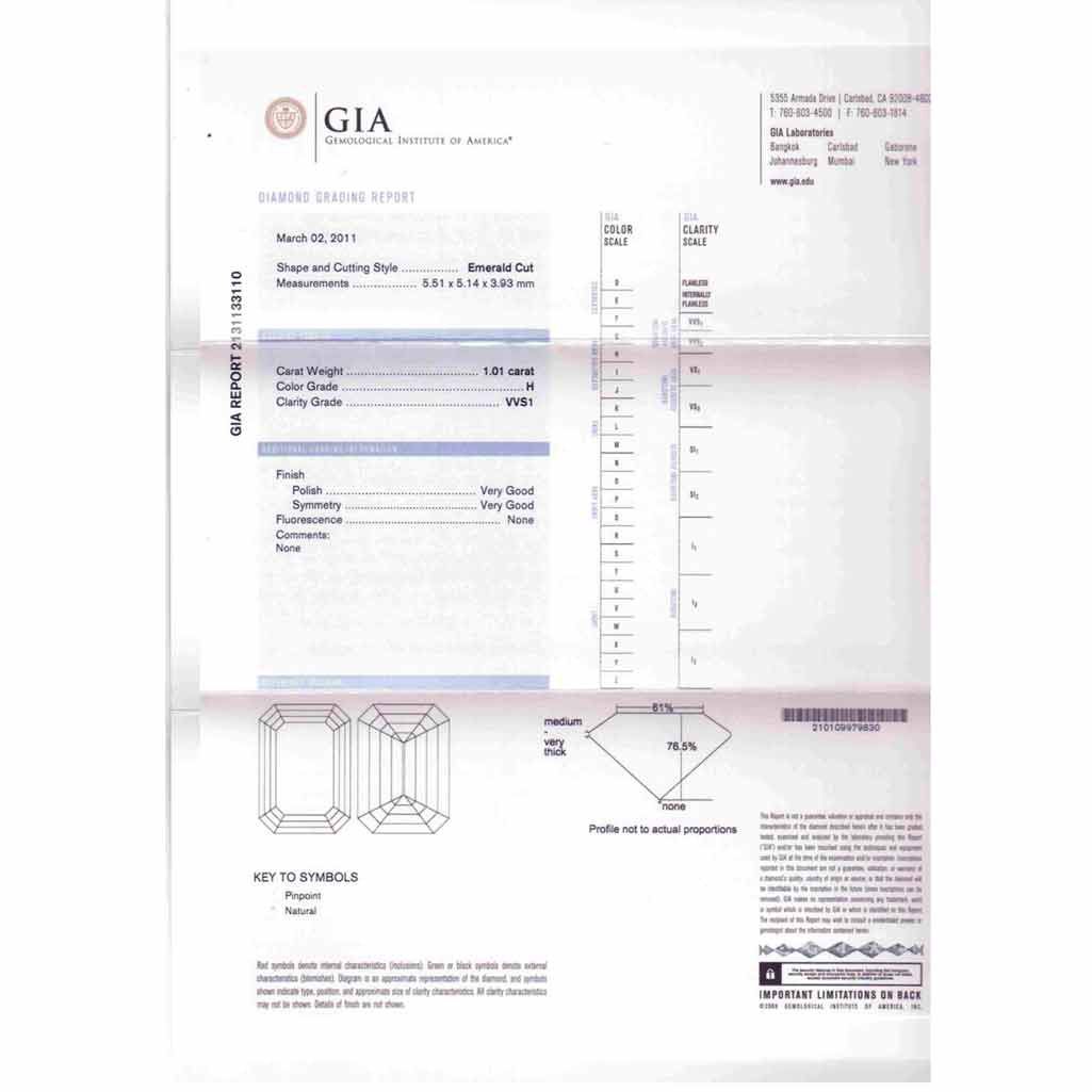 Diamond GIA Cert.ID:213133110 Emerald 1.01 ctw H, VVS1 **|**|** 5.51x5.14x3.93mm;Cut Very Good; Polish Good; Symmetry Very Good; Fluo None; Depth 76.5%; table 61% ; MSRP: $15000