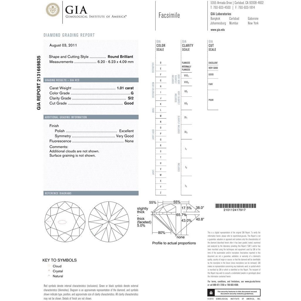 Diamond GIA Cert.ID:2131669835 Round 1.01 ctw G, SI2 **|**|** 6.20-6.23x4.09mm;Cut Very Good; Polish Excellent; Symmetry Very Good; Fluo None; Depth 40.8%; table 55% ; MSRP: $18000