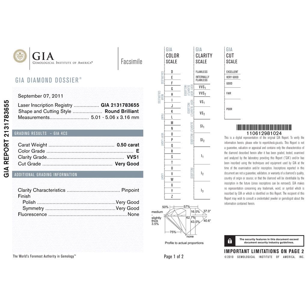 Diamond GIA Cert.ID: 2131783655 Round 0.51 ctw E, VSS1 **|**|** 5.01-5.06x3.16mm;Cut Very Good; Polish Good; Symmetry Very Good; Fluo None; Depth 40.6%; table 57% ; MSRP: $7100