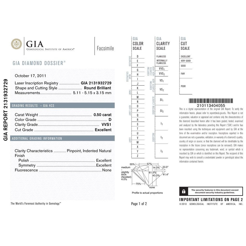 Diamond GIA Cert.ID: 2131932729 Round 0.50 ctw D, VSS1 **|**|** 5.11-5.15x3.15mm;Cut Excellent; Polish Excellent; Symmetry Excellent; Fluo None; Depth 41.4%; table57% ; MSRP: $12000