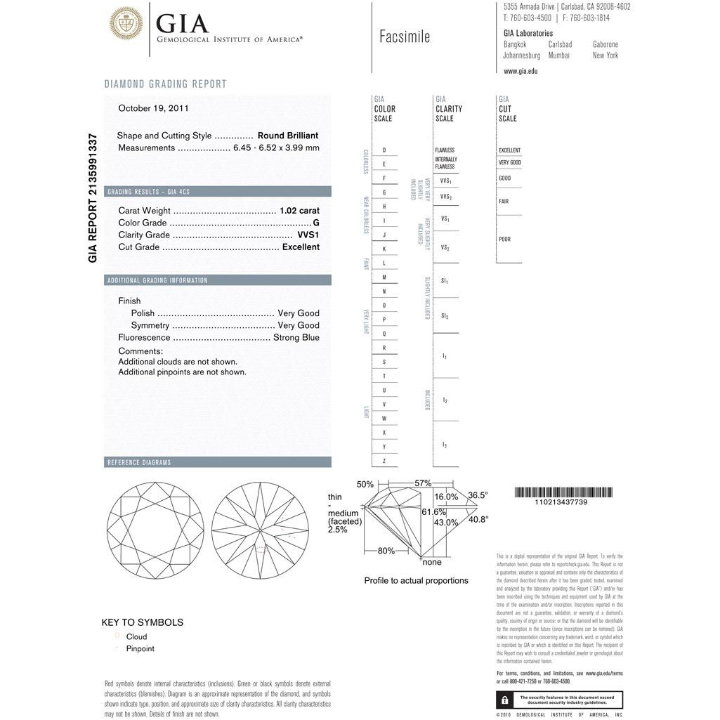 Diamond GIA Cert.ID:2135991337 Round 1.01 ctw G, VSS1 **|**|** 6.45-6.52x3.99mm;Cut Very Good; Polish Good; Symmetry Very Good; Fluo Strong Blue; Depth 40.8%; table 57% ; MSRP: $29000