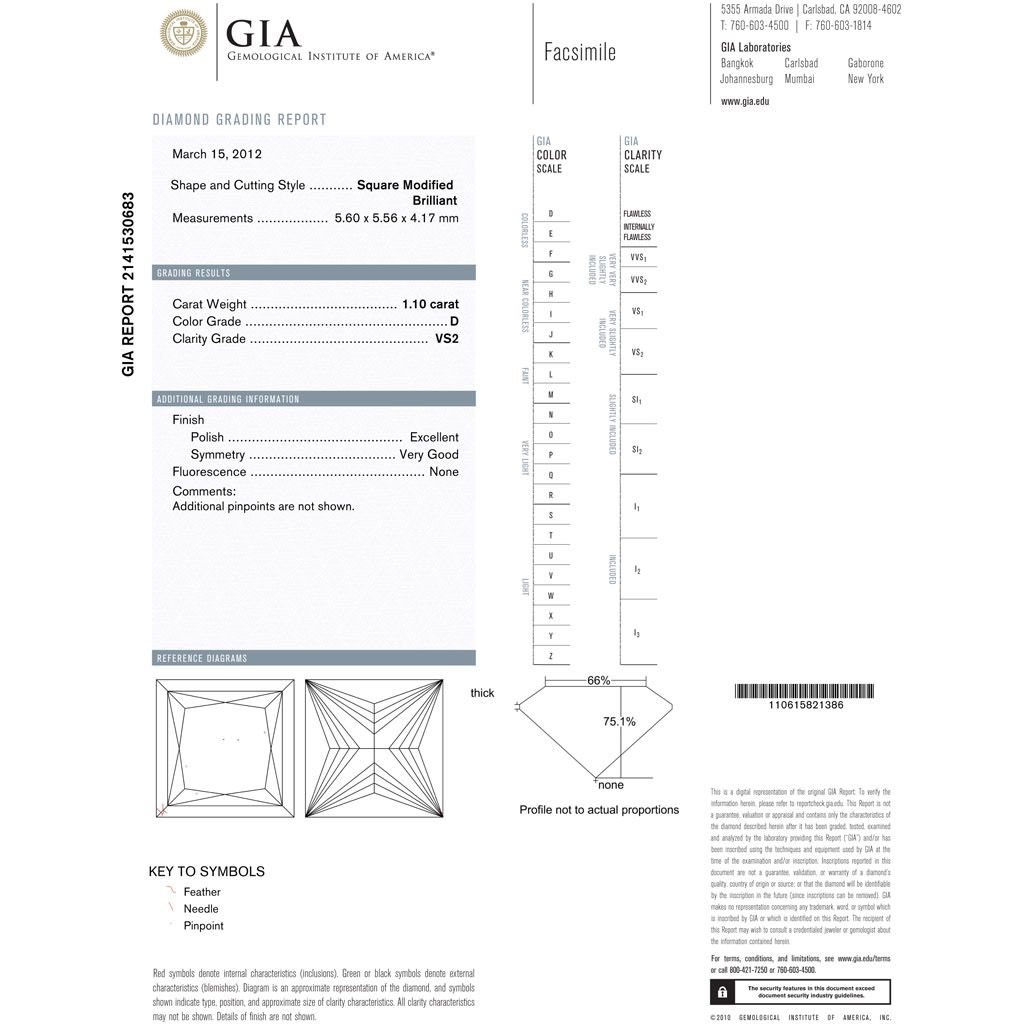 Diamond GIA Cert.ID:2141530683 Square 1.10 ctw D, VS2 **|**|** 5.60x5.56x4.17mm;Cut Very Good; Polish Excellent; Symmetry Very Good; Fluo None; Depth 75.1%; table 66% ; MSRP: $22000
