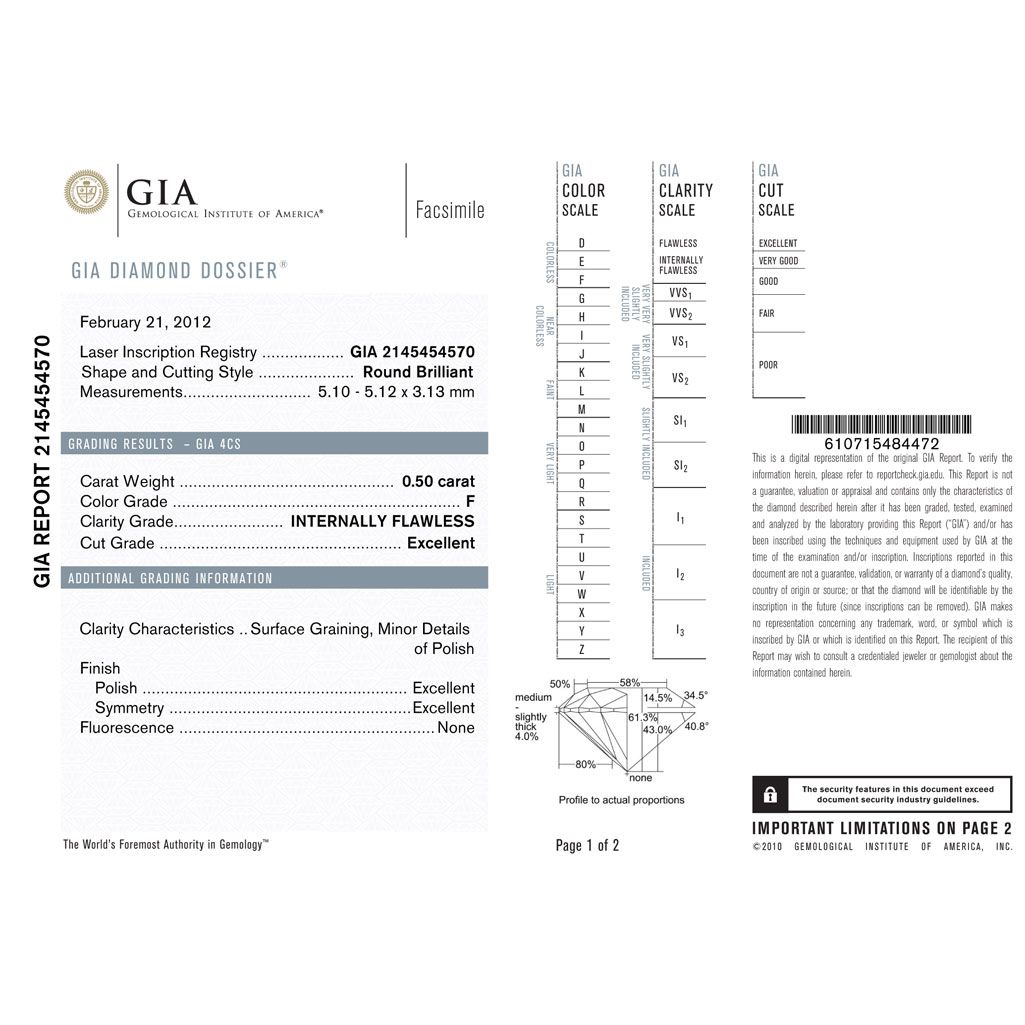 Diamond GIA Cert.ID: 2145454570 0.50ct F, Int. Flawless **|**|** 5.10-5.12x3.13mm;Cut Very Good; Polish Excellent; Symmetry Excellent; Fluo None; Depth 40.8%; table 58% ; MSRP: $21576