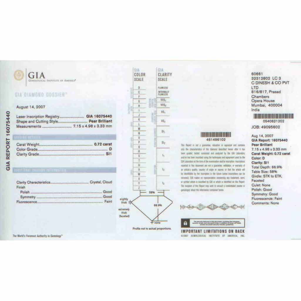 Diamond GIA Cert. Pear 0.72 ctw D, SI1 **|**|** 7.15x4.98x3.33mm;Cut Very Good; Polish Good; Symmetry Very Good; Fluo Faint; Depth 56.9%; table 59% ; MSRP: $11800