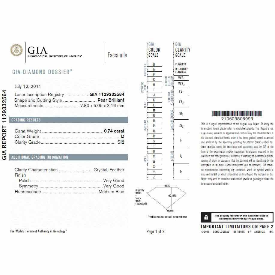 Diamond GIA Cert. Pear 0.74 ctw D, SI2 **|**|** 7.80x5.05x3.16mm;Cut Very Good; Polish Good; Symmetry Very Good; Fluo Medium Blue; Depth 62.5%; table 55% ; MSRP: $10352