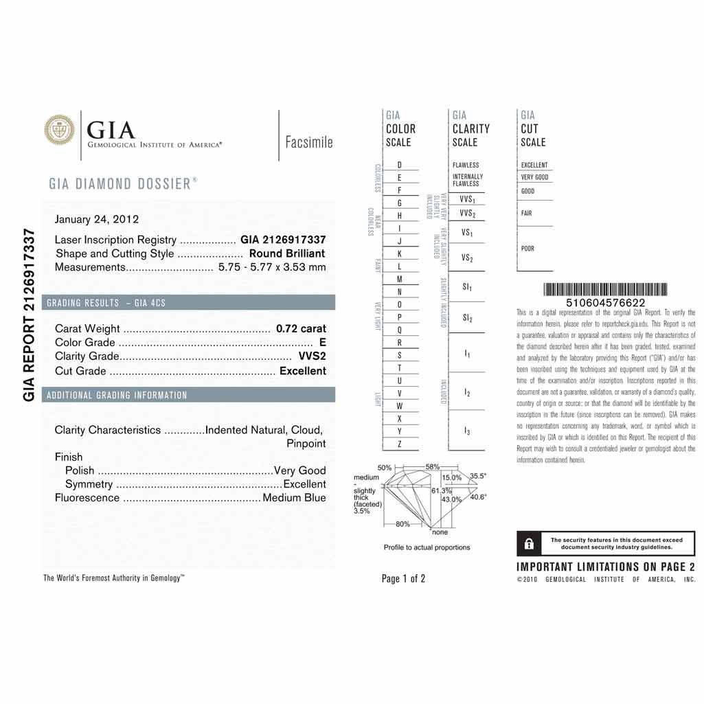 Diamond GIA Cert. Round 0.72 ctw E, VVS2 **|**|** 5.75x5.77x3.53mm;Cut Very Good; Polish Good; Symmetry Excellent; Fluo Medium Blue; Depth 40.6%; table 58% ; MSRP: $12000