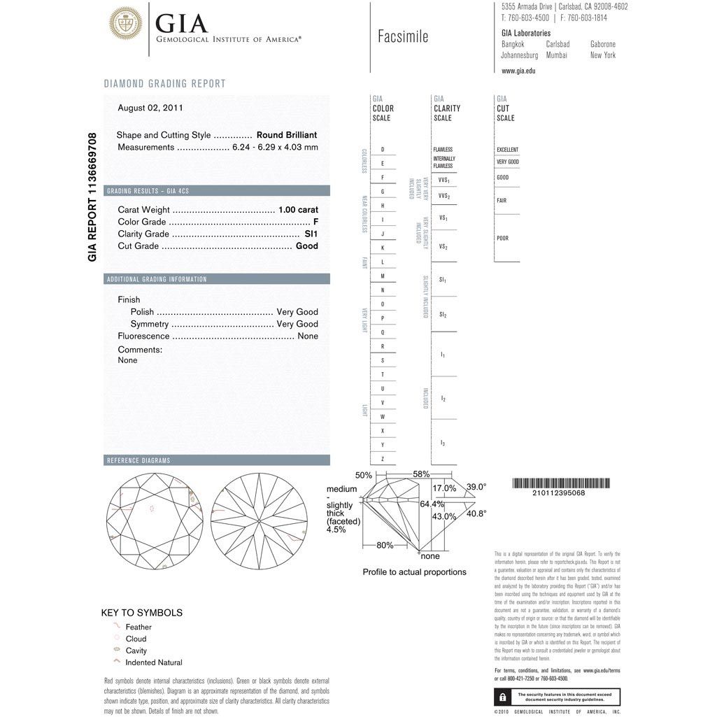 Diamond GIA Cert. Round 1.00 ctw F, SI1 **|**|** 6.24-6.29x4.03mm;Cut Very Good; Polish Good; Symmetry Very Good; Fluo None; Depth 40.8%; table 58% ; MSRP: $20000