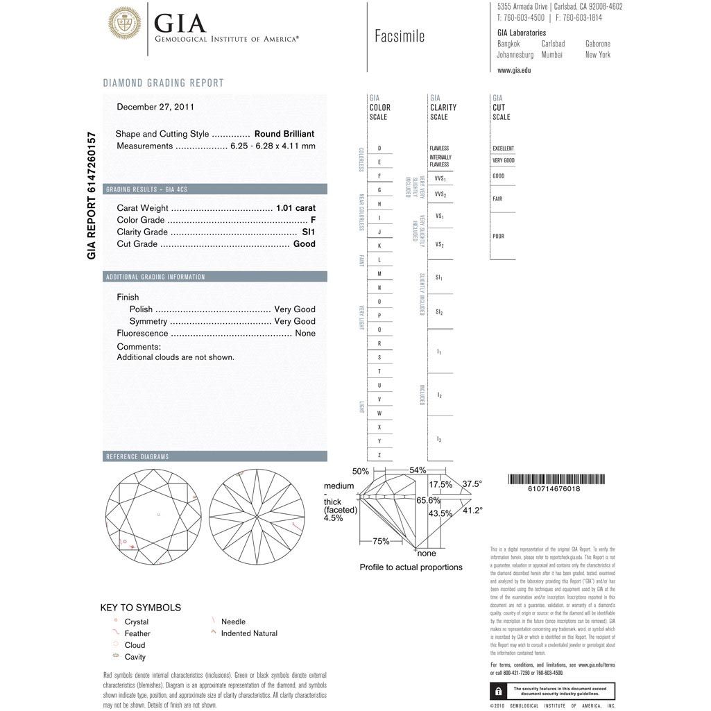 Diamond GIA Cert. Round 1.01 ctw F, Si1 **|**|** 6.25-6.28x4.11mm;Cut Very Good; Polish Good; Symmetry Very Good; Fluo None; Depth 41.2%; table 54% ; MSRP: $22000