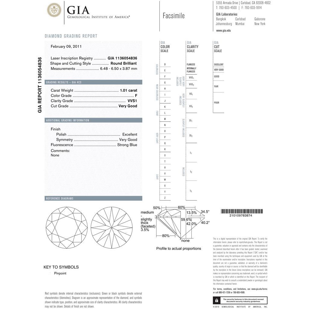 Diamond GIA Cert. Round 1.01 ctw F, VVS1 **|**|** 6.48-6.50x3.87mm;Cut Very Good; Polish Excellent; Symmetry Very Good; Fluo Strong Blue; Depth 40.2%; table 60% ; MSRP: $32000